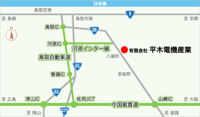 私たち平木電機産業のある鳥取県八頭郡八頭町は、鳥取県の東南部に位置し、東は若桜町及び智頭町、西は鳥取市にそれぞれ接しています。